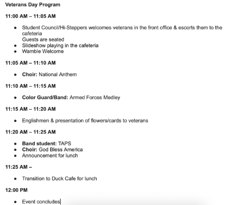 • Veterans Day Ceremony 11a - 12p, THS Band & Guard Officers